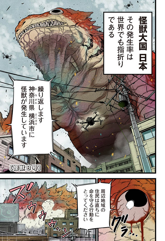 日常的に怪獣が人々をおびやかす世界。怪獣専門清掃業で働く日比野カフカは、かつて怪獣を討伐する「日本防衛隊」への入隊を志していた。だが再び夢を追い始めた矢先、自分自身が「怪獣8号」に変身する能力を得てしまう。