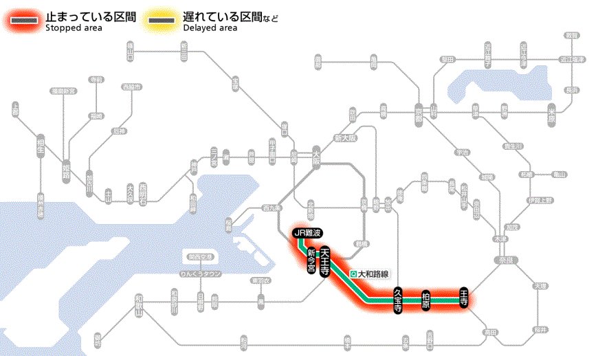 | 大和路線で人身事故 運転見合わせ …23:14頃、志紀~八尾駅間で発生した人身事故の影響で、大和路線は奈良~JR難波駅間の運転を見合わせています。 (出典:レスキューナウニュース) |