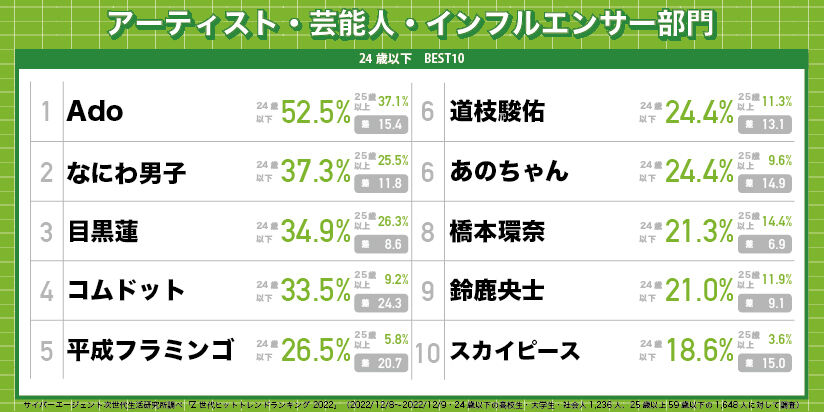 このほか、「Z総研2024年下半期トレンドランキング」では、流行ったYouTubeでは「みなみチャンネル」、食べ物/飲み物は「アサイーボウル」、俳優では「橋本環奈」、アイドルでは「FRUITS ZIPPER」などが1位にランクインしている。