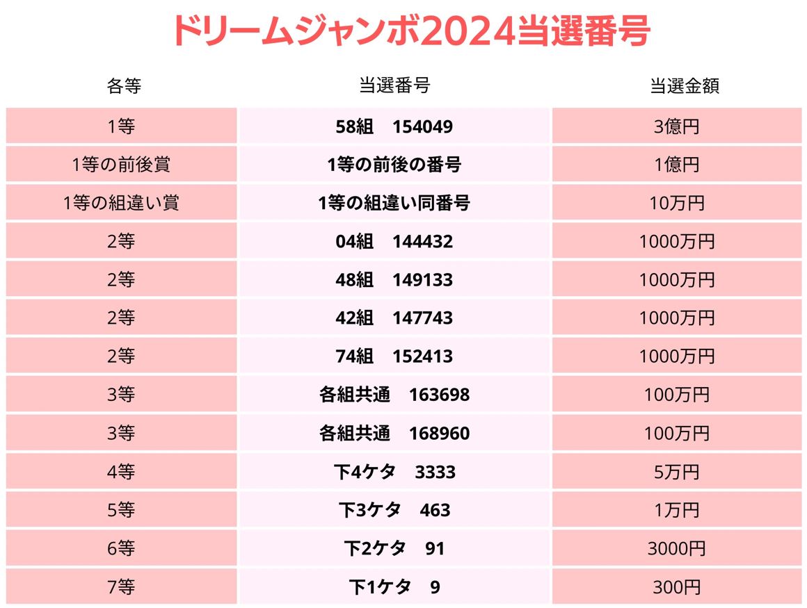 | 【当選一覧】年末ジャンボ・ジャンボミニ 宝くじ …【年末ジャンボ宝くじ第1031回全国自治宝くじ当せん番号表(31日)】 ◇1等(7億円) 110組 106348 ◇1等の前後賞(1.5億円) 1等の前後の番号… (出典:) |