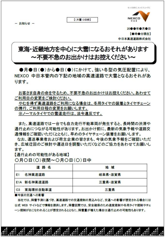 近畿地方整備局(大阪市)などは8日夕、週末の10日にかけて大雪の恐れがあるとして、名神高速や北陸道、舞鶴若狭道、国道8号などで、10日午前中から予防的に通行止めをする可能性が高いと発表した。