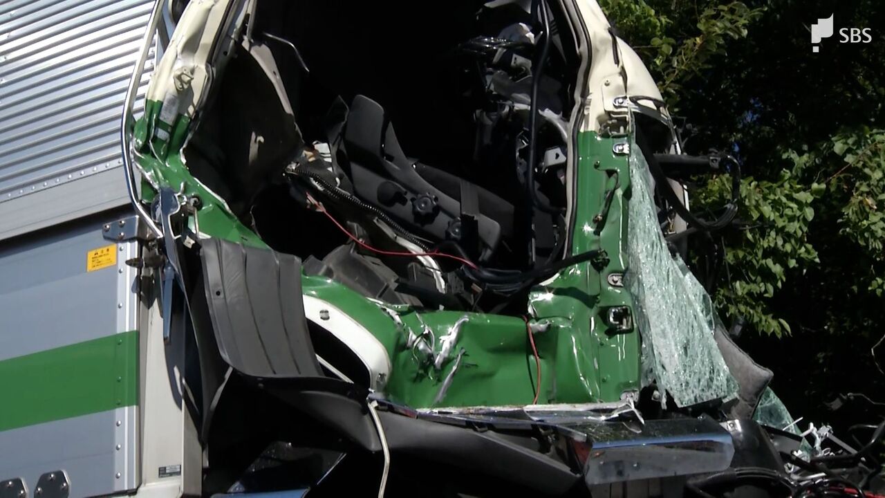 警察によりますとトラック2台と乗用車、高級スポーツカーのあわせて4台が絡む事故で乗用車の運転手1人が軽傷を負いました。