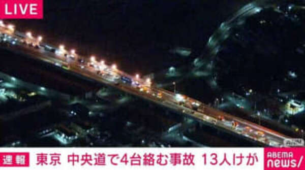 東名高速上りの海老名ジャンクション付近で高級スポーツカーなど4台が絡む事故があり、1人が軽傷を負いました。