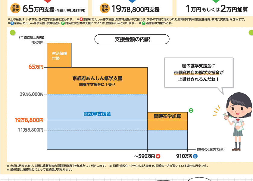 現行の国の制度は、年収910万円未満の世帯を対象に、公立の年間授業料に当たる11万8800円を支給。私立に通わせる年収590万円未満の世帯には、39万6000円まで増額される。文科省によると、7割以上の高校生に支援が行き渡っているという。