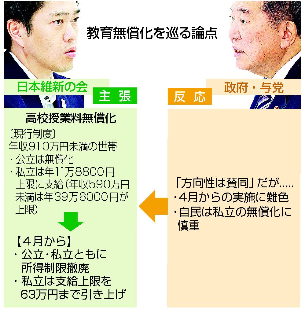 高校授業料の無償化を巡り、与野党の議論が活発化してきた。日本維新の会は2025年度予算案に賛成する条件として、所得制限の撤廃と授業料支援の増額といった現行制度の拡充を与党に迫っている。ただ、自治体独自で先行実施する東京都や大阪府では、公立の志望者が減る「私立シフト」が発生。新たな恩恵が、所得の高い世帯と私立の多い大都市圏に偏る問題もある。(白山泉、石井紀代美)