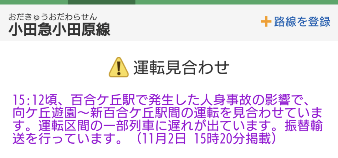 @TAKUTOxxxxまたか。 小田急小田原線で人身事故 一部運転見合わせ(レスキューナウニュース) #Yahooニュース news.yahoo.co.jp/articles/0b64f…
