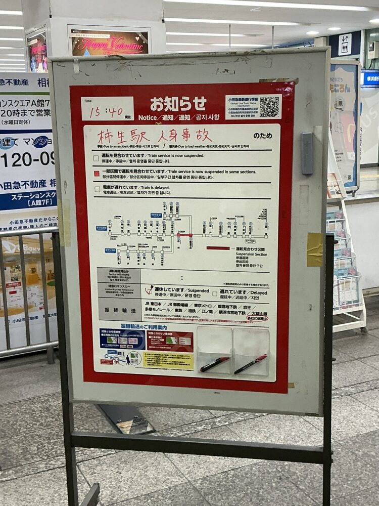 13:31頃、座間~海老名駅間で発生した人身事故の影響で、小田急小田原線は相武台前~海老名駅間の運転を見合わせています。振替輸送を行っています。