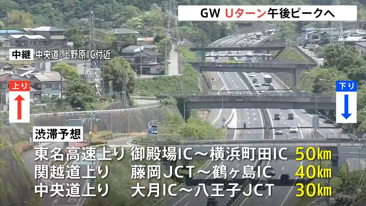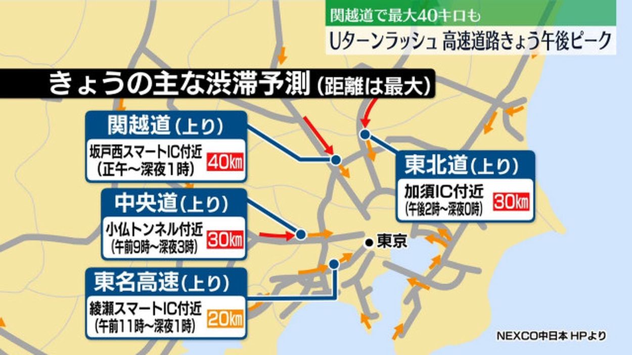 一方、上りのUターンラッシュは午後からピークとなる見込みで、関越道の坂戸西スマートインターチェンジ付近で最大40km、中央道の小仏トンネル付近で最大30kmとなっています。