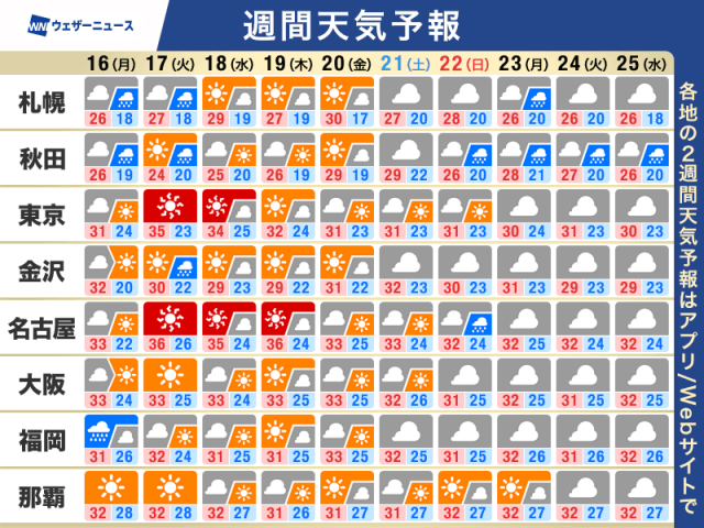 @nunochiman2週間天気予報 今週は猛暑日のところが続出 熱中症に警戒を - ウェザーニュース weathernews.jp/news/202506/16…