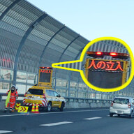 ある日、東名高速を走っていると、路肩にパトロールカーが停まっていました。車体上の表示板には「人の立入」との文言が。もう少し進むと、パトロール隊員に見守られながら、人がてくてくと高速道路上を歩いていたのです。隊員は赤い旗を右手に掲げ、路肩のそばを走るクルマから目立つように付き添っていました。