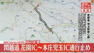 日本道路交通情報センターによりますと、雨の影響で、関越道の花園インターチェンジから本庄児玉インターチェンジの間の上下線が、午後4時半前から通行止めとなっているということです。
