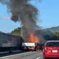 事故は、トラックが前方の軽乗用車に追突し、トラックと軽乗用車が燃えた。軽乗用車の前方を走行していた2台も巻き込まれた。