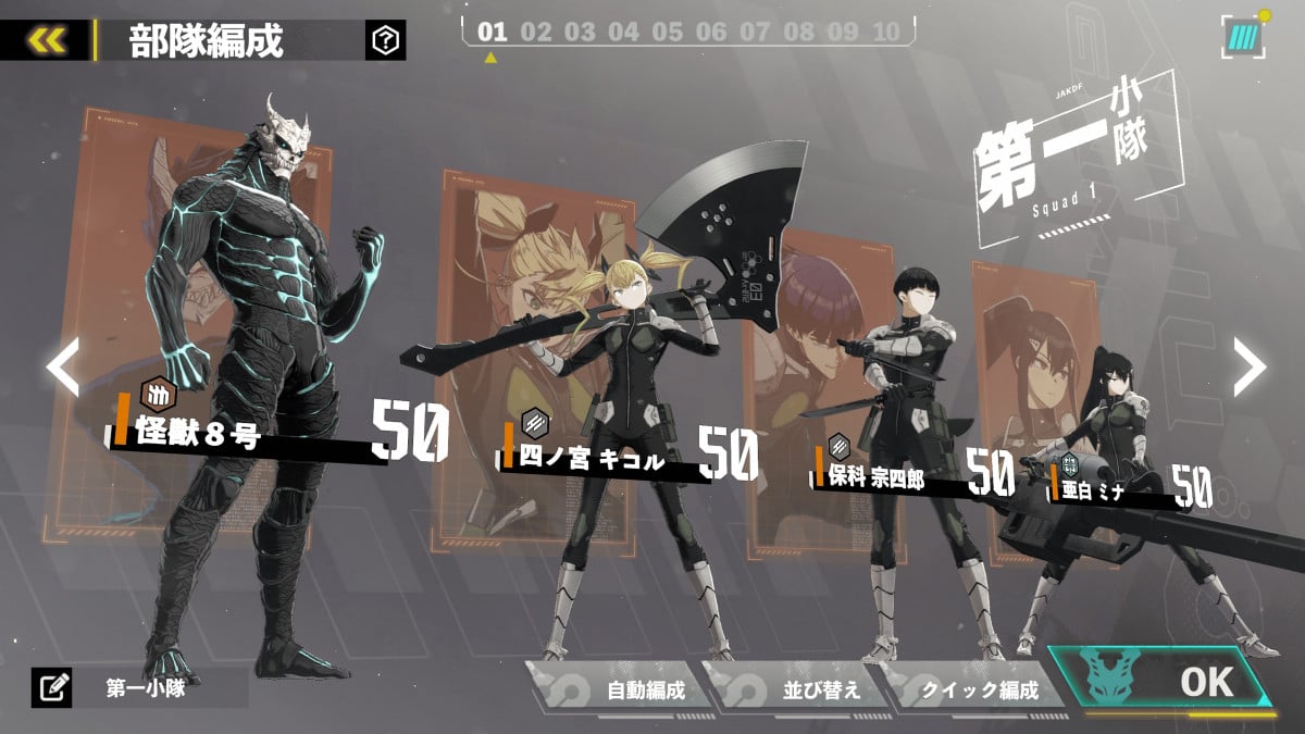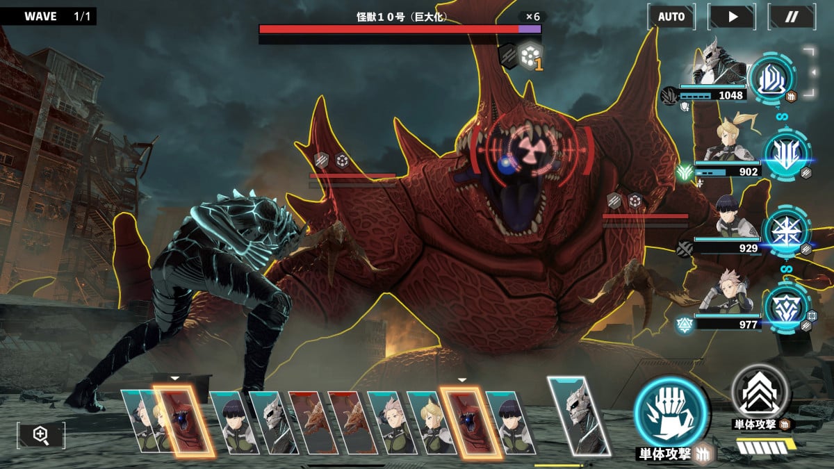 本作の戦闘は、4人の仲間を編成して挑むターン制コマンドバトルを基盤としており、通常攻撃やスキル、必殺技を駆使して戦う。敵の耐性を破壊して「核」を露出させると、仲間との追撃コンボが発動する独自システムにより、『怪獣8号』らしい共闘感と緊張感ある戦闘を体験できる。