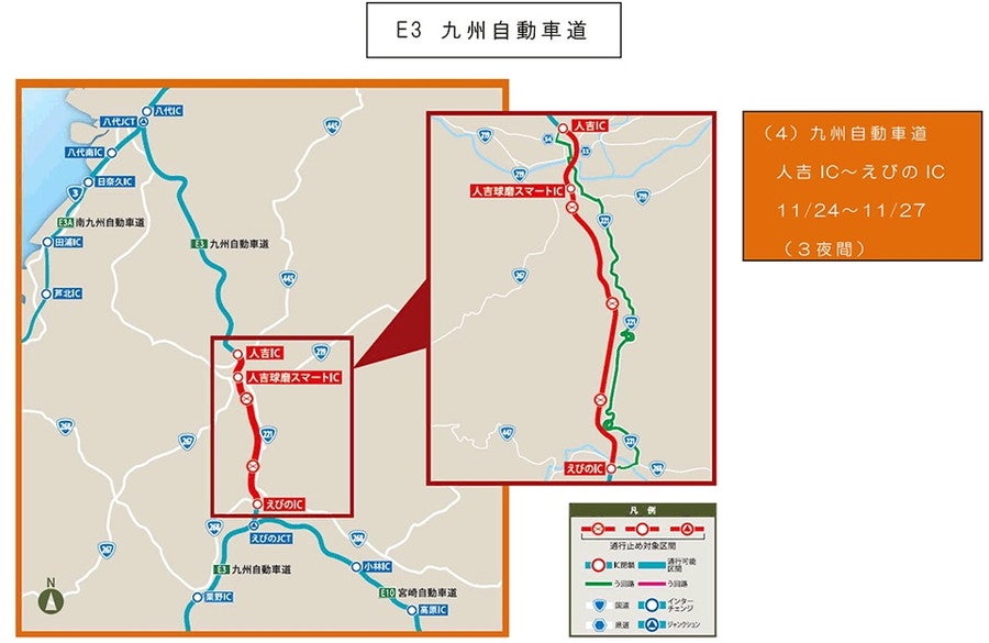 ネクスコ西日本によりますと、九州自動車道は、熊本県の松橋ICと八代ICの間の上下線で、工事のため通行止めとなっています。