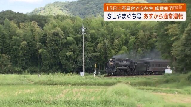 JR山口線の新山口-津和野駅(島根県)間を走る観光列車「SLやまぐち号」が20日、通常運転を再開した。心配された車体トラブルを解消し、試運転での安全確認を経て、その雄姿を現した。