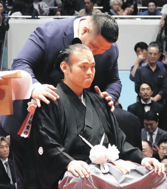 断髪式にはおよそ300名が参加。現役横綱の大の里、豊昇龍や小池百合子都知事、元小結・阿武咲、母の佐藤純子さんらが次から次へとはさみを入れ、最後は師匠である常盤山親方の止めばさみで、幕内優勝4回の人気力士が大銀杏に別れを告げた。