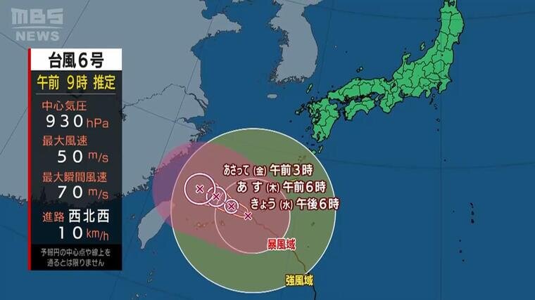 10日午後6時には南大東島の北北東約120キロの北緯26度50分、東経131度35分を中心とする半径85キロの円内に達する見込みです。中心の気圧は998ヘクトパスカル、中心付近の最大風速は23メートル、最大瞬間風速は35メートルが予想されます。