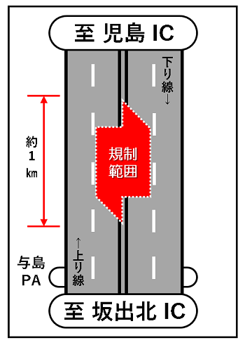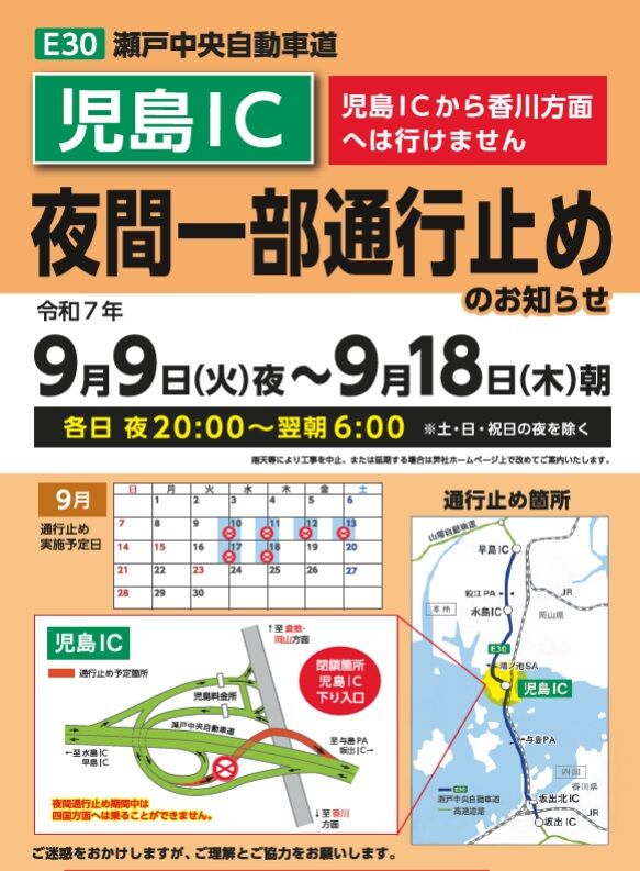 本四高速によりますと、児島IC~坂出IC(上下線)で午前9時から時速50kmの速度規制が行われています。