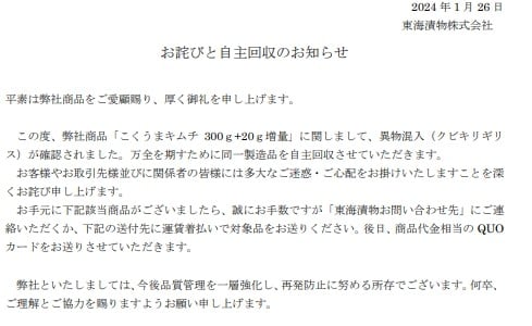 同社によると、キムチは関西地区のスーパーで販売したもの。7日夜、女性は商品に虫が付着している動画と写真を添えて投稿し、「キムチに虫混入してたんだがwww もう2度とこのキムチ買えない。。。」と訴えた。翌8日には同社の担当者から謝罪を受け、「パッケージの帯状のフィルムの中にキムチが発酵して爆発しないように容器に加工がされていて(小さい虫なら出入りできそうなサイズ感)そこから虫が侵入したのではと考えています」との見方を示した。