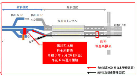 11日午前11時ごろ、第二京阪道路の鴨川東インターチェンジ(京都市伏見区)につながる道路「鴨東トンネル」内で、トラックと軽自動車の正面衝突事故が発生した。影響で、午後2時現在、鴨東トンネルは上下線で通行止めになっている。