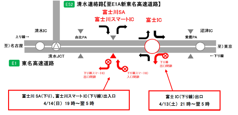 12月14日(日)午前2時から午前6時の間で東名上り足柄サービスエリア入口の閉鎖を行います。 閉鎖中は、高速道路本線から上り足柄サービスエリア及び上り線足柄スマートIC出口がご利用になれません。 ご迷惑をおかけしますが、近隣のIC、休憩施設をご利用下さいますようにお願いいたします。 ご理解とご協力をお願いいたします。 詳しくは、NEXCO中日本お客さまセンター 0120-922-229 までお問い合わせ下さい。