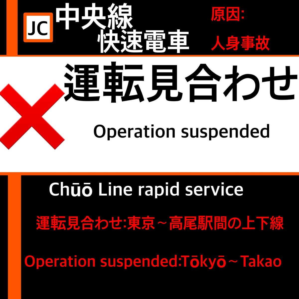 @minisyaro0715中央線快速 西国分寺駅で人身事故発生 この影響で、中央線快速は東京〜高尾間で運転見合わせ pic.x.com/D0vCvIFPMU