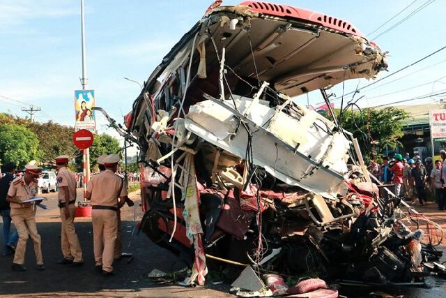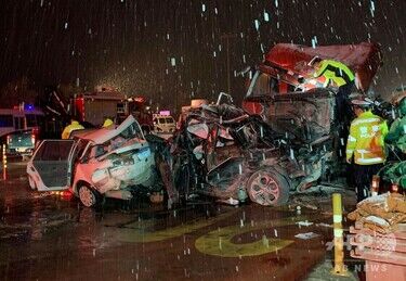 事故現場では、大きく前がひしゃげた車が4台並び、その横にトラックが横倒しになっていた。