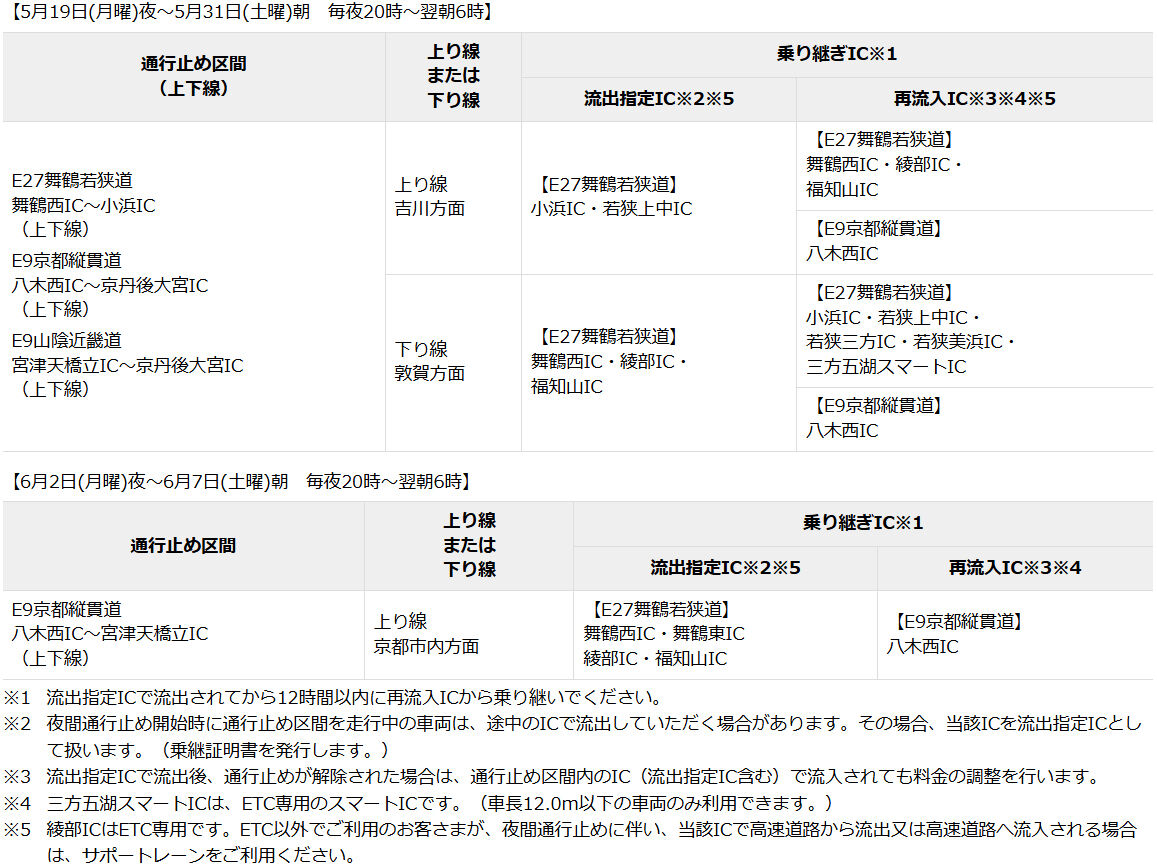 西日本高速道路(ネクスコ西日本)は26日午後8時〜27日午前6時、舞鶴若狭自動車道の舞鶴西インターチェンジ(IC、京都府舞鶴市)-小浜IC(福井県小浜市)の上下線約46・5キロ区間を通行止めにする。