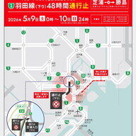 首都高速道路は、1号羽田線(東品川桟橋~鮫洲埋立部)のリニューアル工事に伴う舗装改良工事で、芝浦~勝島間(下り)の通行止めを5月9日0時~10日24時に実施する。これにより芝浦入口(下り)は通行止めとなる。